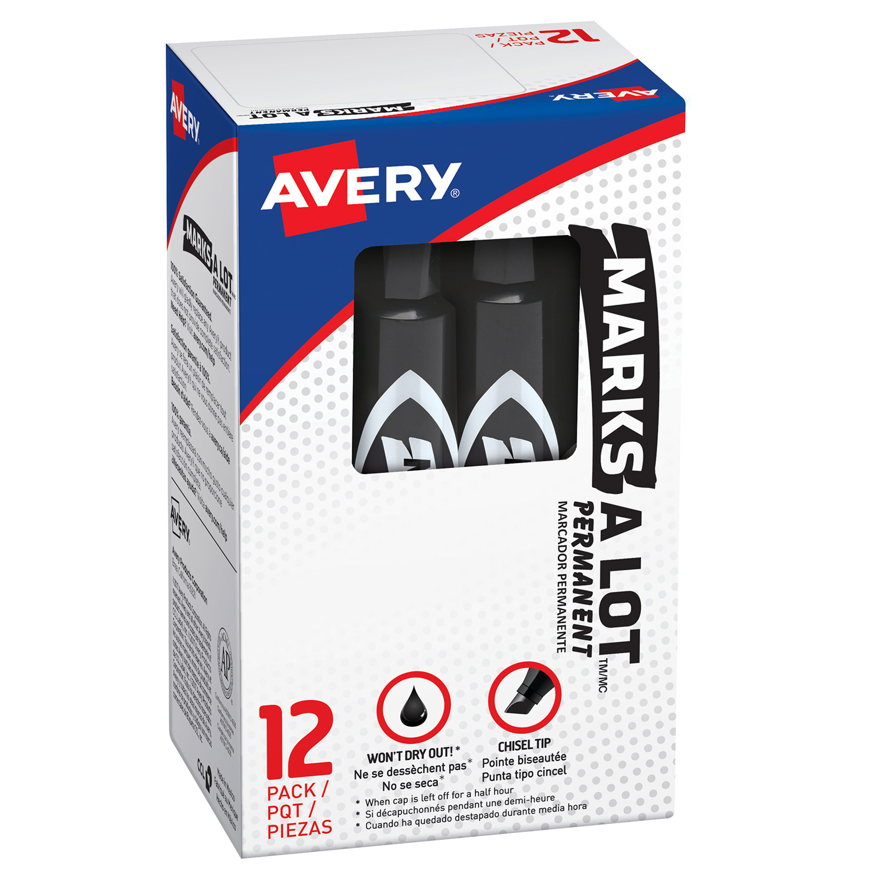 Cuando necesitas un marcador cuya tinta resista el paso del tiempo, puedes contar con Marks A Lot®. La tinta permanente marca prácticamente sobre cualquier superficie cartón, plástico, metal, vidrio, papel y más. Resistente a la fricción, el agua y la decoloración. La tinta es baja en olor, no tóxica y certificada. Su fórmula de secado rápido minimiza el contacto accidental con la tinta húmeda. La punta tipo cincel permite tres anchos de línea para obtener notas legibles en pequeñas y grandes superficies.